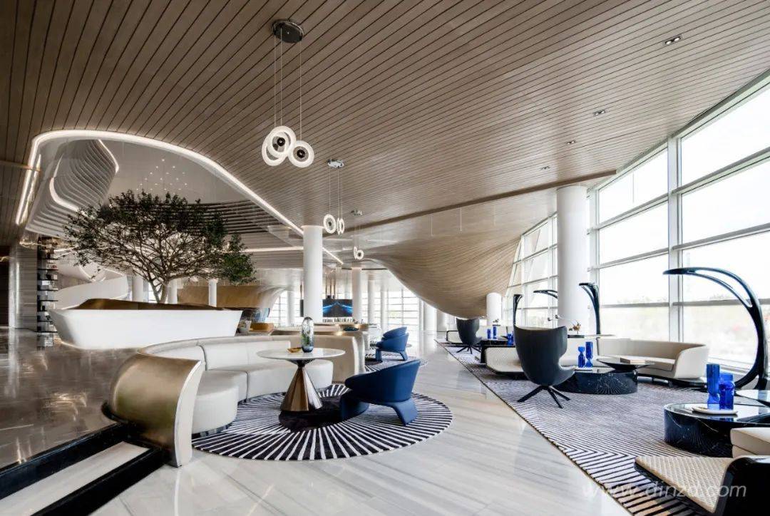 藍白交替的座椅強調了海浪的設計元素,原木天花與“精靈之樹”營造原始的生機,是人文生態的象形物,亦是大自然饋贈的象征。VIP室利用弧形幕窗營造私密的設計格調,打造純粹干凈的私享空間。