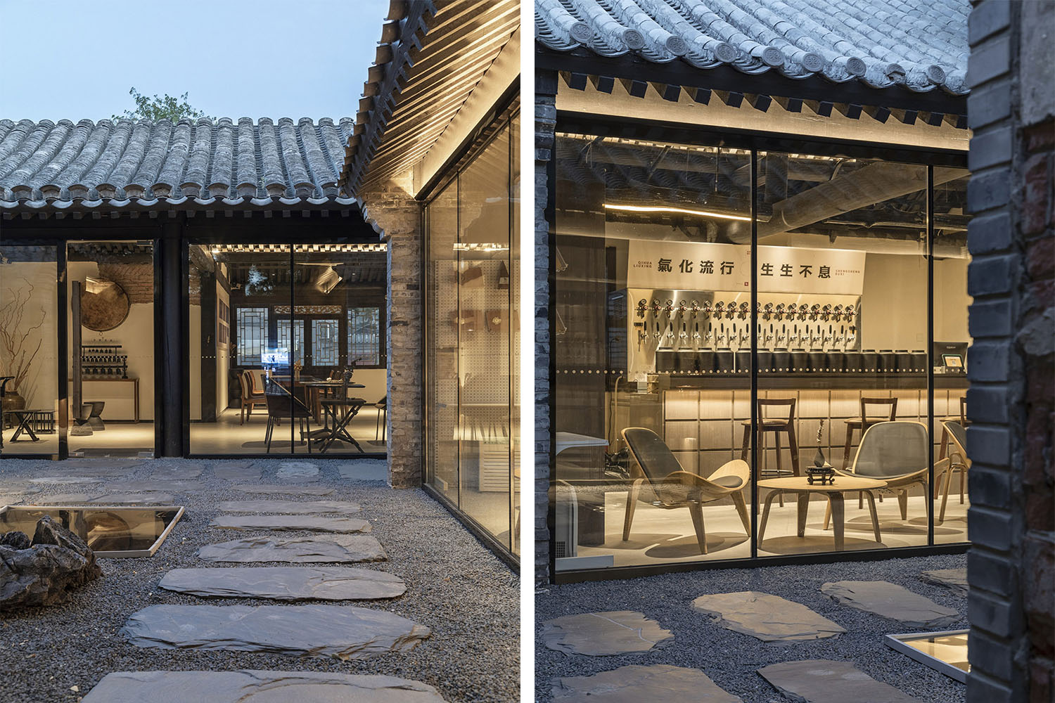室內、建筑與自然在相互界定中融會貫通,形成一個可以相互滲透的空間結構。我們對原有院落中的墻面、門窗、屋架、鋪地等構造系統進行了整理與修復。設計建設過程中避免使用與地域及歷史時代不相符的現代工業(yè)材料和處理方式,在此基礎上,把通透屬性的落地玻璃墻嵌入磚混結構的承重柱里,使得室內外動靜的變化隨時保持著溝通與互動。