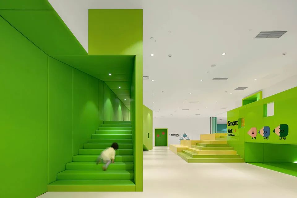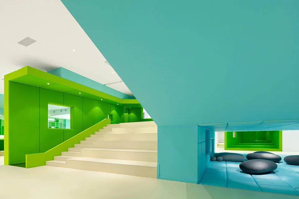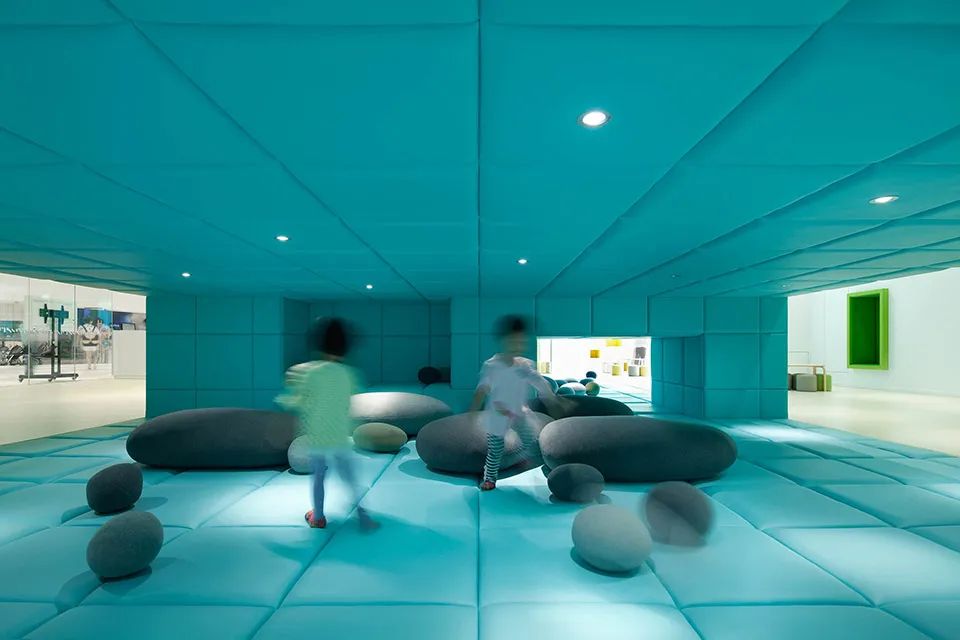 當小朋友和成人進入大門時,家盒子內精選而整體的顏色有效地過濾商場紛雜的廣告色彩和強烈的商業化感官。設計中的黃、藍、綠代表著青島的地域特色(沙、天和海)并分別象征著不同的設計元素,讓兒童更容易區分不同區域的關系。