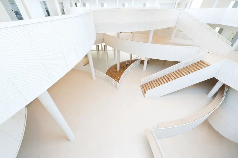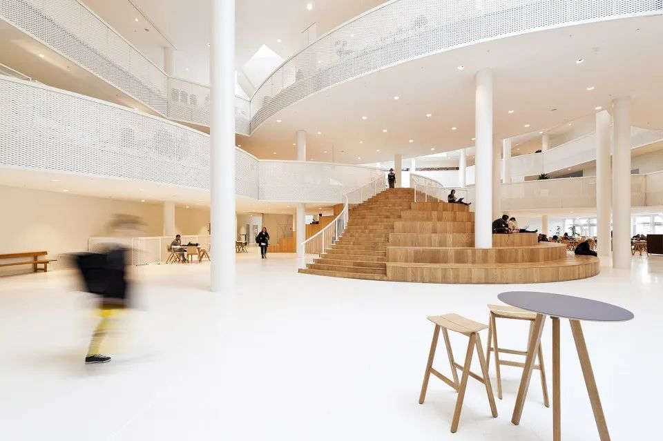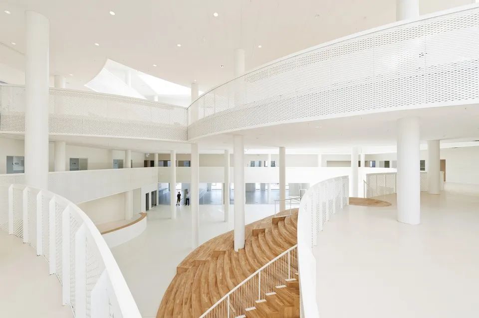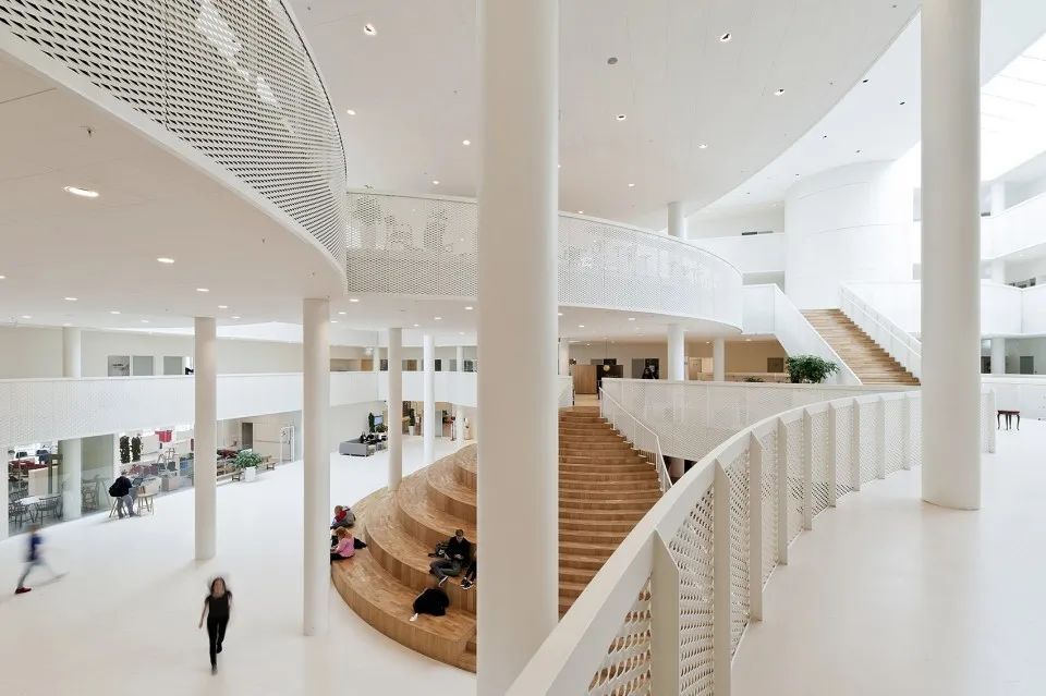 設計師將從粗野環境中提取的工業元素融入到學校氛圍之中,與其內部開放兼容的空間組織相結合,將海港與城市生活真正連接到一起。建筑樸素的外觀與內部變幻多樣的圓形元素形成了強烈的對比,為1300位學生創造了多樣化的學習環境:一所使用方式靈活多樣,同時也為個人學習提供充足空間的綜合學校建筑。