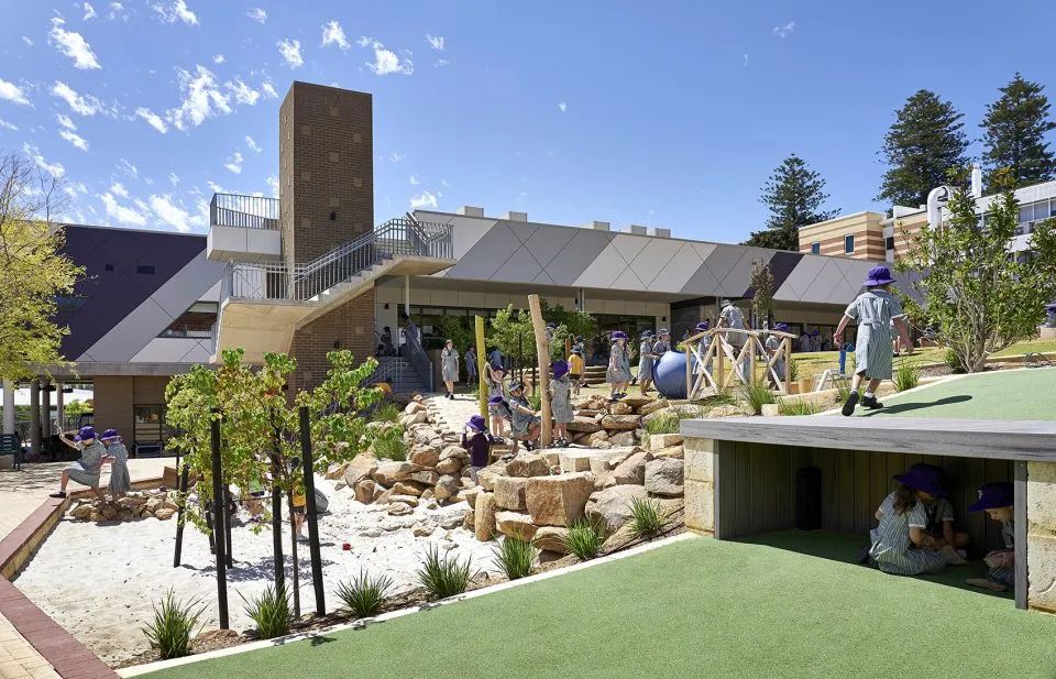 項目位于一個陡峭的斜坡上,內容包括對一棟遺產建筑以及一棟建于1980年代的教學樓進行翻修,同時額外修建一棟新的建筑。這三棟建筑各自擁有不同的樓層。受到保護的校園核心地帶坐落著寬闊的天然操場,這里也是該項目的亮點所在。操場與教室形成了積極的連接,可作為教學空間的延伸,同時為各個功能空間提供了適宜的路徑。